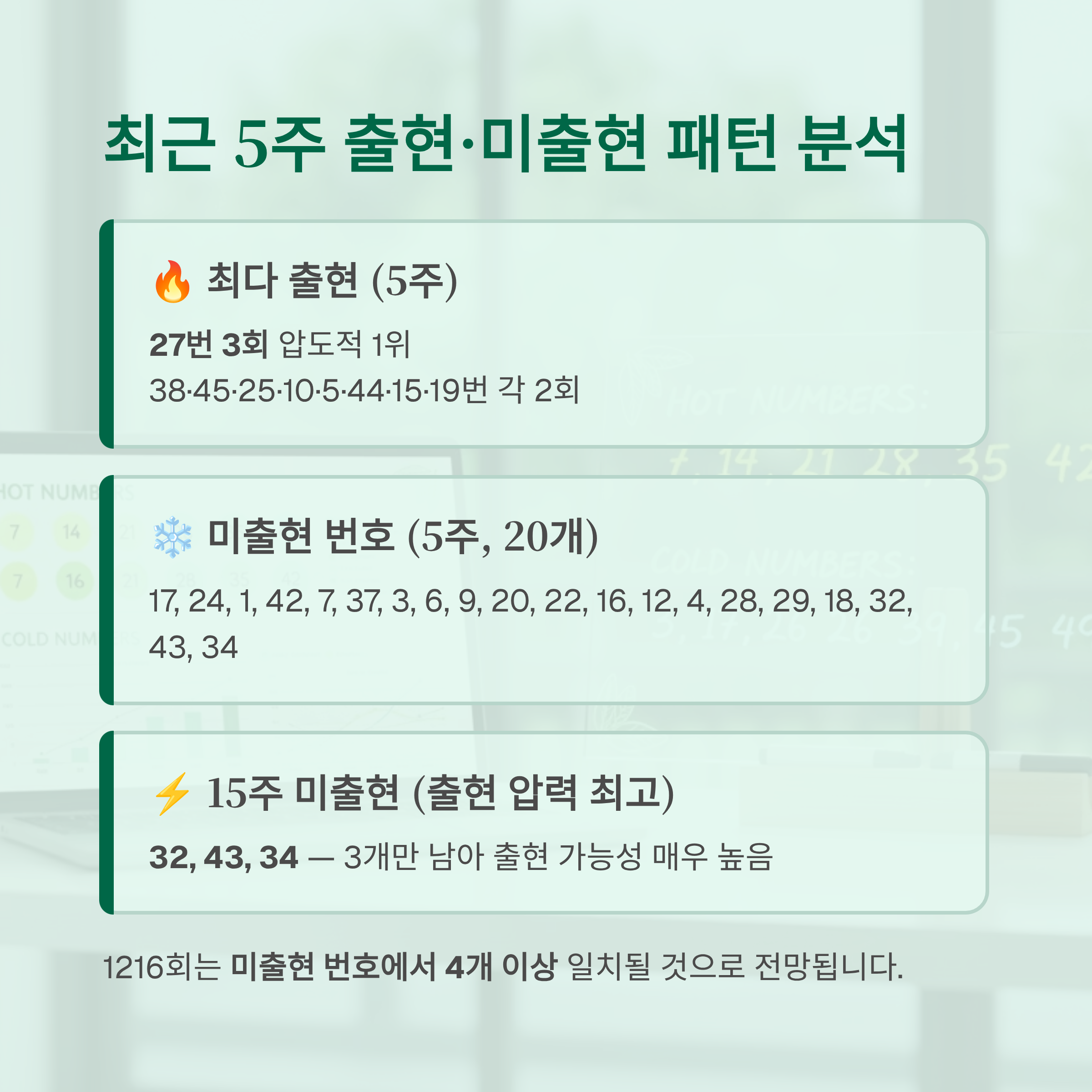 1215회는 출현 번호에서 4개(15, 19, 44, 45), 미출현 번호에서 3개(13, 21, 39)가 일치했고, 직전 1214회는 미출현 번호에서 5개가 일치한 바 있습니다. 이번 1216회는 미출현 번호에서 4개 이상 일치될 것으로 전망되고 있어, 최근 5주간 나오지 않았던 번호들에 주목할 필요가 있습니다.